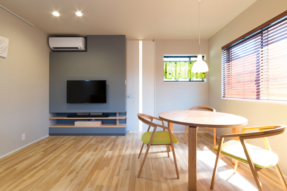 自然採光とペンダントライト、ダウンライトで明るいリビングダイニングスペース。エアコンに合わせたテレビボード